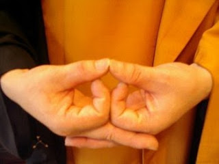 因為往常並未正式入顯密法門中修持,因此對於諸佛菩薩及手印經咒等事也沒特別深入研究。 有一回與朋友聊天時提及六字大明咒的讀誦發音問題,就上網查找資料,偶然間看到某個網頁中的幾張照片,頓時嚇了一跳,那幾張照片竟然就是自己靜坐時常結的手印! 彌陀定印(妙觀察智印,又稱除散亂心印。)這個印,是屬蓮華部的印相,《金剛頂經瑜伽修習毗盧遮那三摩地法》云: